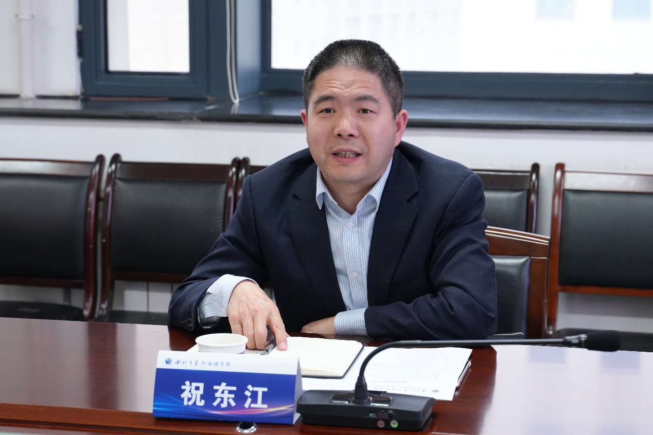 2026年4月8日下午,汉江师范学院yl6809永利官网集团院长祝东江一行四人莅临我院开展调研考察与交流活动。交流座谈会在学院会议室举行,院长曹若男主持会议,教学副院长李蓂、英语系主任李铁、日语系主任王欢及院长助理许娜参加会议,双方围绕外语学科建设与人才培养核心议题展开全方位探讨。