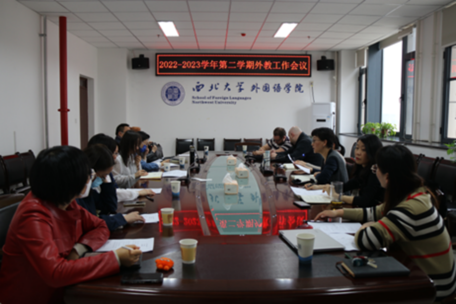 On March 15, 2023, at 4:00 p.m., the special meeting for foreign teacher management in the second semester of the 2022-2023 academic year was held in the school’s conference room to enhance foreign teacher management. The meeting was chaired by Dean Cao Ruonan and attended by Vice Dean Li Mi, Dean’s Assistant Xu Na, Foreign Affairs Secretary Chen Juan, directors, vice directors of English, Japanese, and Russian departments, as well as foreign teachers.