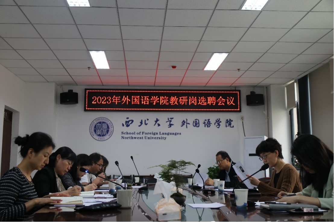 On April 20, 2023, at 2:00 p.m., the 2023 Teaching and Research Post Hiring Meeting of School of Foreign Languages was held in the school’s conference room. The meeting was chaired by Yang Ying, Deputy Dean of Administration, and attended by Wang Jun, Secretary of the Party Committee, Dean Cao Ruonan, Li Mi,  Deputy Dean of Teaching, Su Rui, Deputy Dean of Research, Li Tie, Director of the English Department, and Xu Na, Dean’s Assistant.