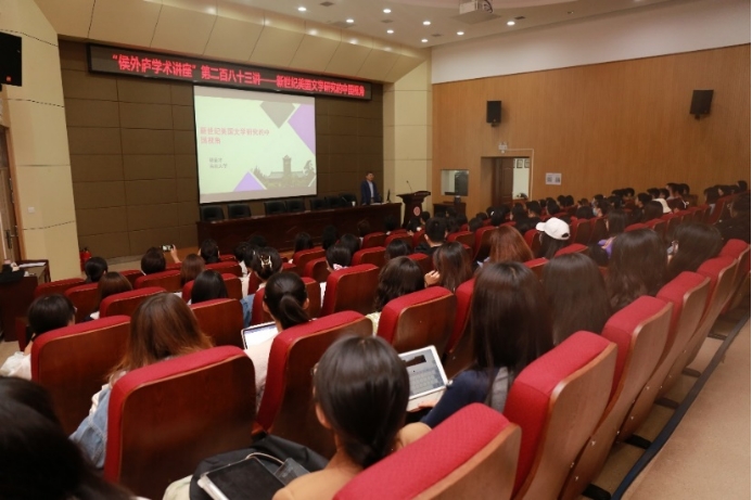 Professor Yang Jincai then began his lecture.  Professor Yang elucidated insights we can gain for our current study and reference of foreign literary and cultural works from President Xi Jinping’s important proposition of the “great changes unseen in a century”. He mainly focused on four aspects: the concept of “great changes” in the context of China, the focal points of research on contemporary American literature, the implications of "great changes" for China in the new era, and research strategies and orientations. Professor Yang Jincai pointed out that research on contemporary foreign literature should be “embedded in the presence of the Chinese context”, rooted in China and facing the world, speaking out for Chinese academics. Using the Chinese context (perspective, position andviewpoint) as a prism, scholars should understand and familiarize themselves with international academic frontiers, identify blind spots in American academia, and allow American counterparts to view their literature and culture from a different perspective, thereby showcasing the cross-cultural perspective of foreign literature research. He also emphasized the importance of delving into American social history, respecting historical facts, and gaining a deeper understanding of the more authentic aspects behind superficial culture.