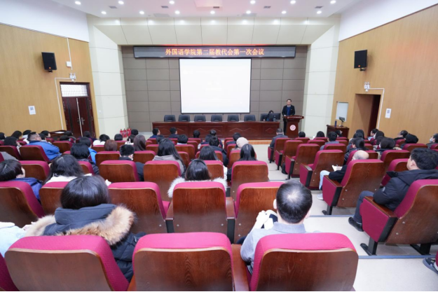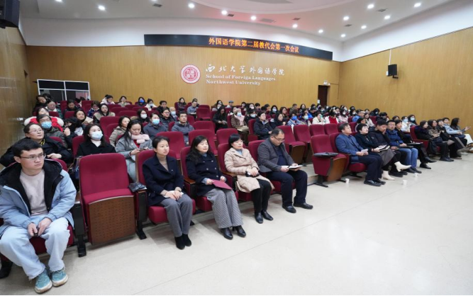 On January 13, the Second General Assembly of the Faculty and Staff of the School of Foreign Languages at Northwest University held its first meeting of the second session in the Lecture Hall 2. The meeting was attended by all Party and administrative leaders of the School, as well as the entire faculty and staff. Tian Bingquan, Chairman of the University Labor Union, was also present at the meeting.