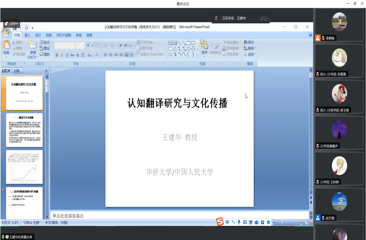 During the online session, Professor Wang Jianhua engaged in discussions and exchanges with faculty and students on topics related to cognitive translation research and cultural communication. The lecture enhanced the understanding of cognitive translation research among faculty and students and broadened their perspectives on cultural communication research.