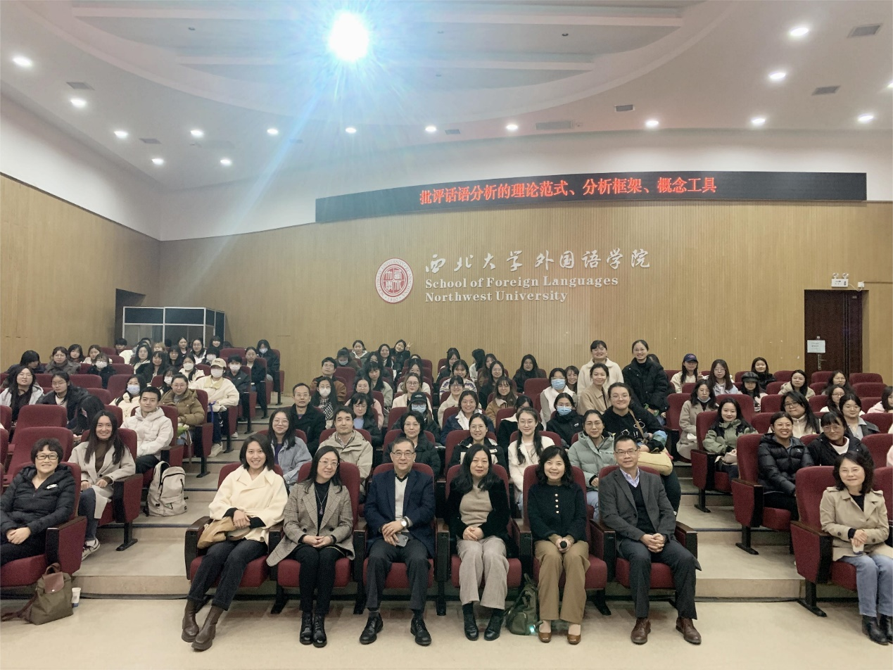On the afternoon of November 21, 2023, Professor Tian Hailong, a distinguished professor from China University of Petroleum (Beijing), doctoral supervisor at Tianjin Foreign Studies University, honorary president of the Sociolinguistics Branch of the Chinese Linguistic Society, secretary-general and vice president of the Discourse Studies Professional Committee of the Chinese Comparative Study of English and Chinese Society, and deputy secretary-general of the Symbolic Studies Professional Committee of the Chinese Logic Society, visited the School of Foreign Languages at Northwest University for a Lecture titled Theoretical Paradigms, Analytical Frameworks, and Conceptual Tools of Critical Discourse Analysis. The lecture, moderated by Vice Dean Su Rui from the School of Foreign Languages, was attended by over 100 faculty and students.
