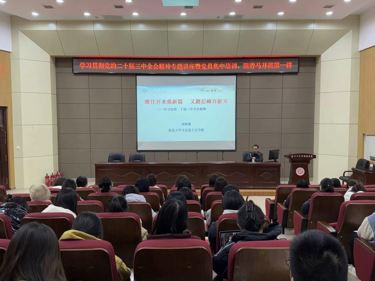 为深入学习贯彻党的二十届三中全会精神,切实增强广大青年的责任感和使命感,按照学院党委安排,11月27日晚,学院党委特邀马克思主义学院苟昭赟老师在第二课堂报告厅开展了关于“学习贯彻党的二十届三中全会精神”专题讲座。讲座由学院党委副书记刘建波主持,学院教师党员代表、2024年下半年发展对象、入党积极分子代表和第五期青马分校学员100余人参加本次讲座。