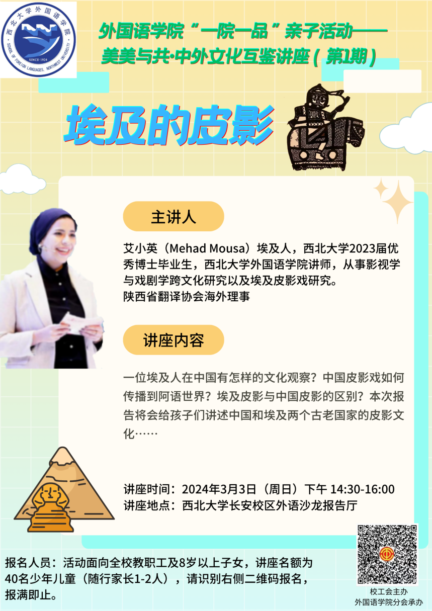 2024年3月3日下午,一场别开生面的“埃及的皮影”讲座在yl6809永利集团长安校区外语沙龙报告厅举行。本次讲座是yl6809永利官网集团分会“一院一品”亲子活动的首场讲座,主讲人为yl6809永利官网集团的埃及外教艾小英(Mehad Mousa)博士,为我校教职工及其子女讲述“美美与共·中外文化互鉴”大背景下的中国和埃及文化交流与传播。