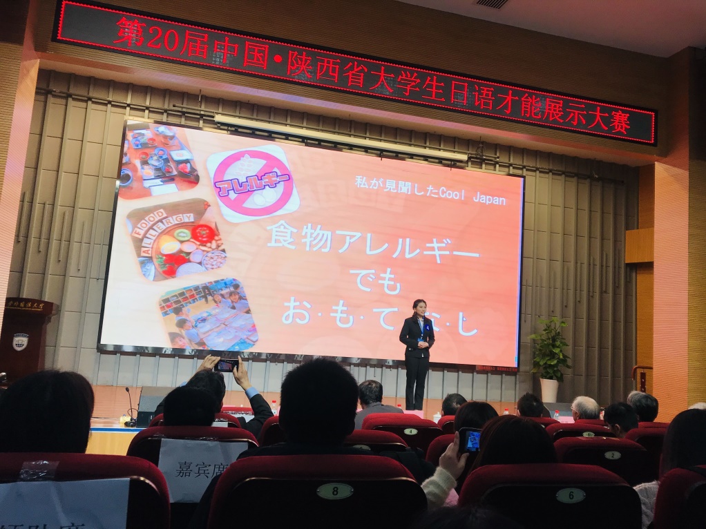 我院日语系杜华嵘同学在指导老师高桥智子的指导下,发表内容构思新颖,研究深刻,表现沉稳大方,自信流畅。以“食物过敏也能‘热情款待’”为题,介绍了日本人在食物过敏上的对策和细心,提出对中国食物过敏人群的关心和对策,呼吁对食物过敏问题的关心和重视。