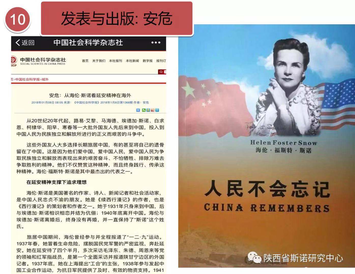 第十件事。2018年1月8日,安危老师在《中国社会科学杂志社》发表文章“从海伦·斯诺看延安精神在海外”,很有启发意义。安老师今年还在陕西延安精神研究院的杂志《源流》发表文章宣传海伦斯诺精神;还出版了《人民不会忘记》一书,汇集了这几十年来中外学者在海伦·斯诺重大纪念活动中的发言和讲话文章,这本书又是一部难得的海伦斯诺研究的工具书和史料。