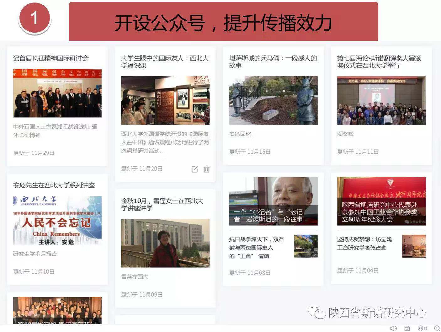 中心理事魏锋在开设公众号时给予秘书处细致的指导,就如何组织设计推文主题、什么时候发布推文等具体操作给予详细的建议。安危老师在时事新闻大节点上,及时给我们提供新闻稿源,帮助我们推送了埃德加·斯诺的第二任妻子路易斯惠乐去世的纪念文章、堪萨斯城兵马俑来历的文章、宝鸡凤县张革风记忆中的路易艾黎等文章。中心理事张占勤、张文雅老师也都慷慨地接受秘书处的电话采访,同意我们推送他们的工作研究成果。咱们理事成员关注中心的这个宣传小阵地,给予公众号非常大的支持。秘书处也将在明年开始,升级公众号排版效果,把它打造成为中心宣传的有力渠道。