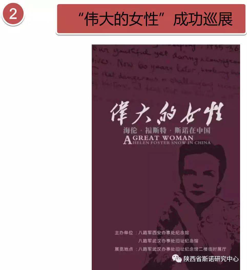 2018年3月7日,“伟大的女性——海伦·斯诺专题展览”在黑龙江省东北烈士纪念馆展出;4月1日,海伦展览在八路军武汉办事处旧址纪念馆开展。海伦斯诺展览走出陕西,配合革命传统教育,以积极的方式面向公众和青少年。