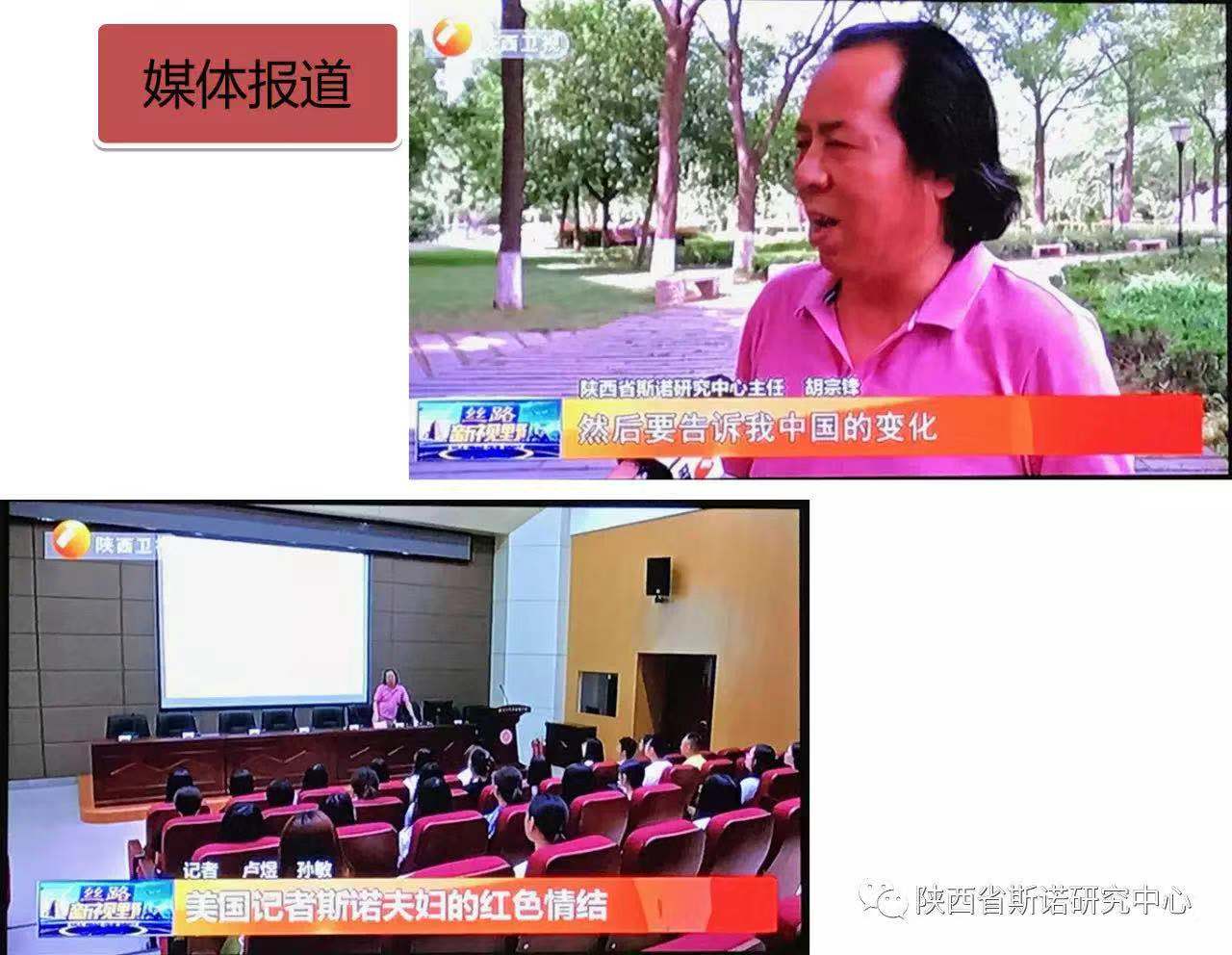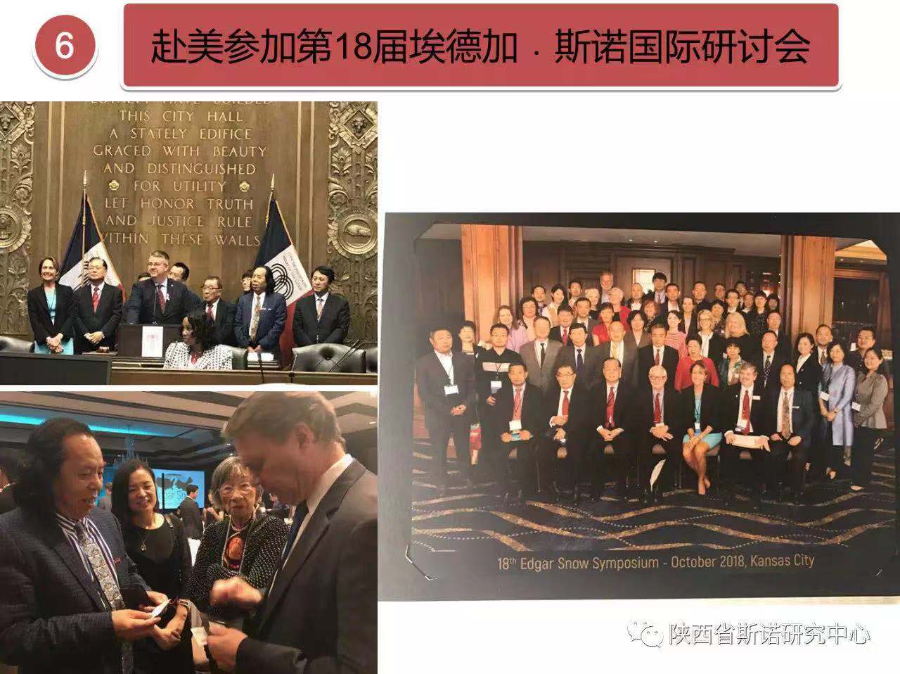 第六件事,今年国庆期间,在中心主任胡宗锋教授的带队下,斯诺中心代表团一行八人:袁西玲、尚亚宁、高敏娜、孙静、刘力群、刘晓峰、马逸飞参加了在斯诺的故乡——美国密苏里州堪萨斯城举行的第18届埃德加·斯诺国际研讨会。研讨会上,胡主任受邀在堪萨斯城市政厅发言,还在会议上提问发言,受到电视新闻转播。研讨会专为陕西代表团开设了分会场,向与会代表介绍陕西斯诺研究中心的工作成就。