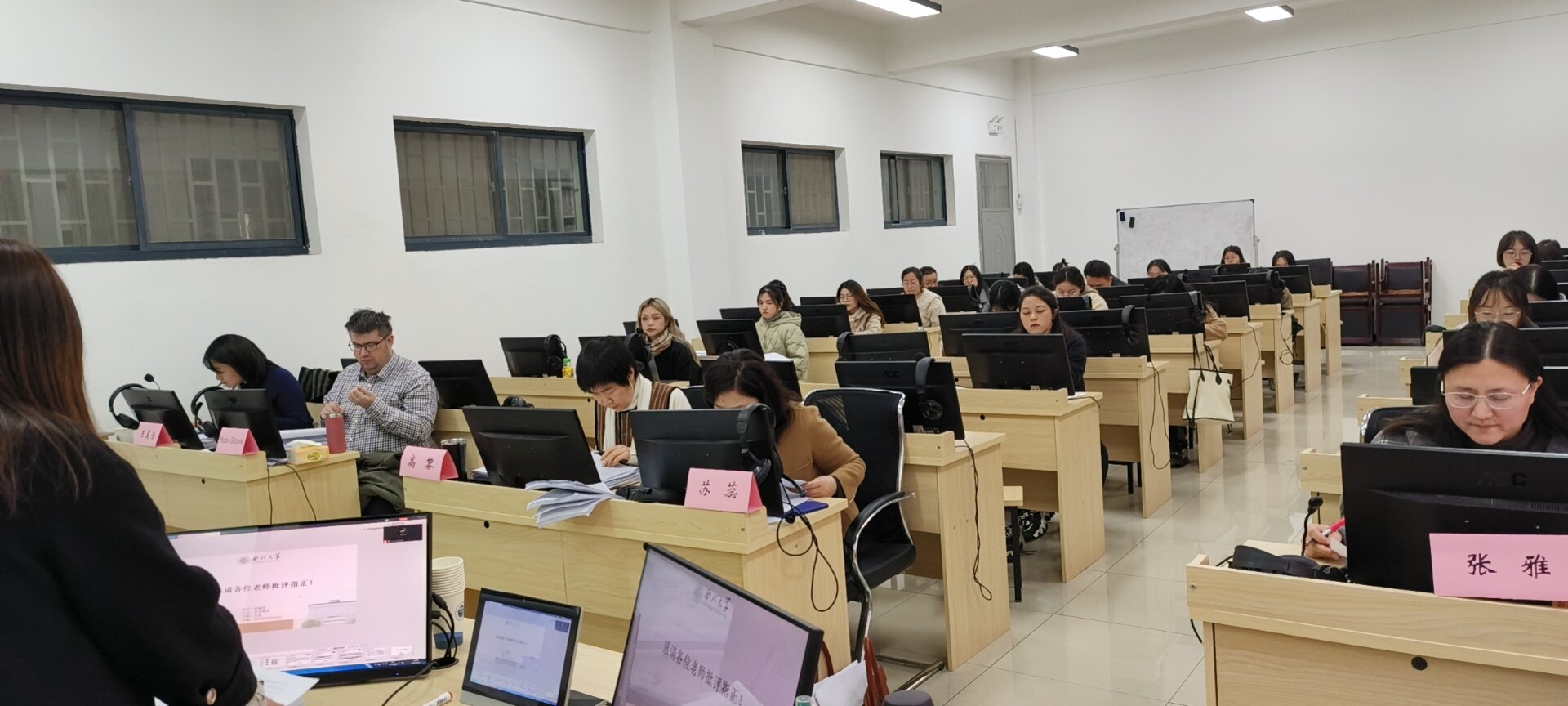 预答辩按照专业分组进行,全体硕导出席并作为答辩评委进行指导。答辩流程模拟学位论文答辩程序,研究生逐一汇报论文要点,答辩委员从撰写格式、选题内容、理论依据、研究方法等方面多角度就论文存在的问题进行交流,并督促学生进一步提升学位论文的学术水平与写作质量。答辩过程紧凑有序,师生互动达到预期效果。同时,新晋导师和低年级学生的全员参与,也起到了较好的示范引领作用。