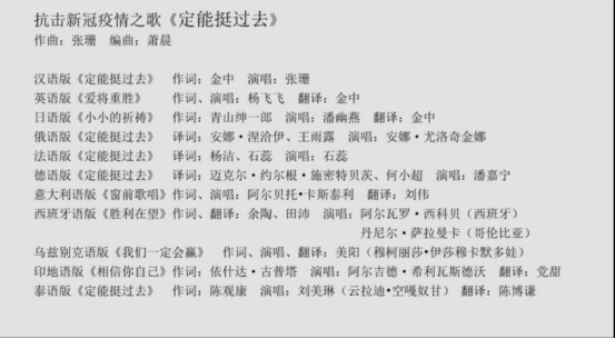 抗疫歌曲《定能挺过去》发布之初,立即受到中国驻白俄罗斯大使馆的关注。在使馆工作人员的努力下,仅用21天时间便完成了歌曲的俄语翻译、演唱和音乐片的录制,并由此开启了多语种歌曲创作的契机。随后,法语和德语版本也相继问世。与此同时,英文歌曲《爱将重胜》和意大利文歌曲《窗前唱歌》的诞生为这首歌曲的全球性传播起到了不小的助推作用。日本词作家使用该曲旋律创作的日文歌曲《小小的祈祷》也在日本网站广受好评。目前,该曲已完成英、日、俄、法、意等共计12国语言的歌曲音乐片制作。