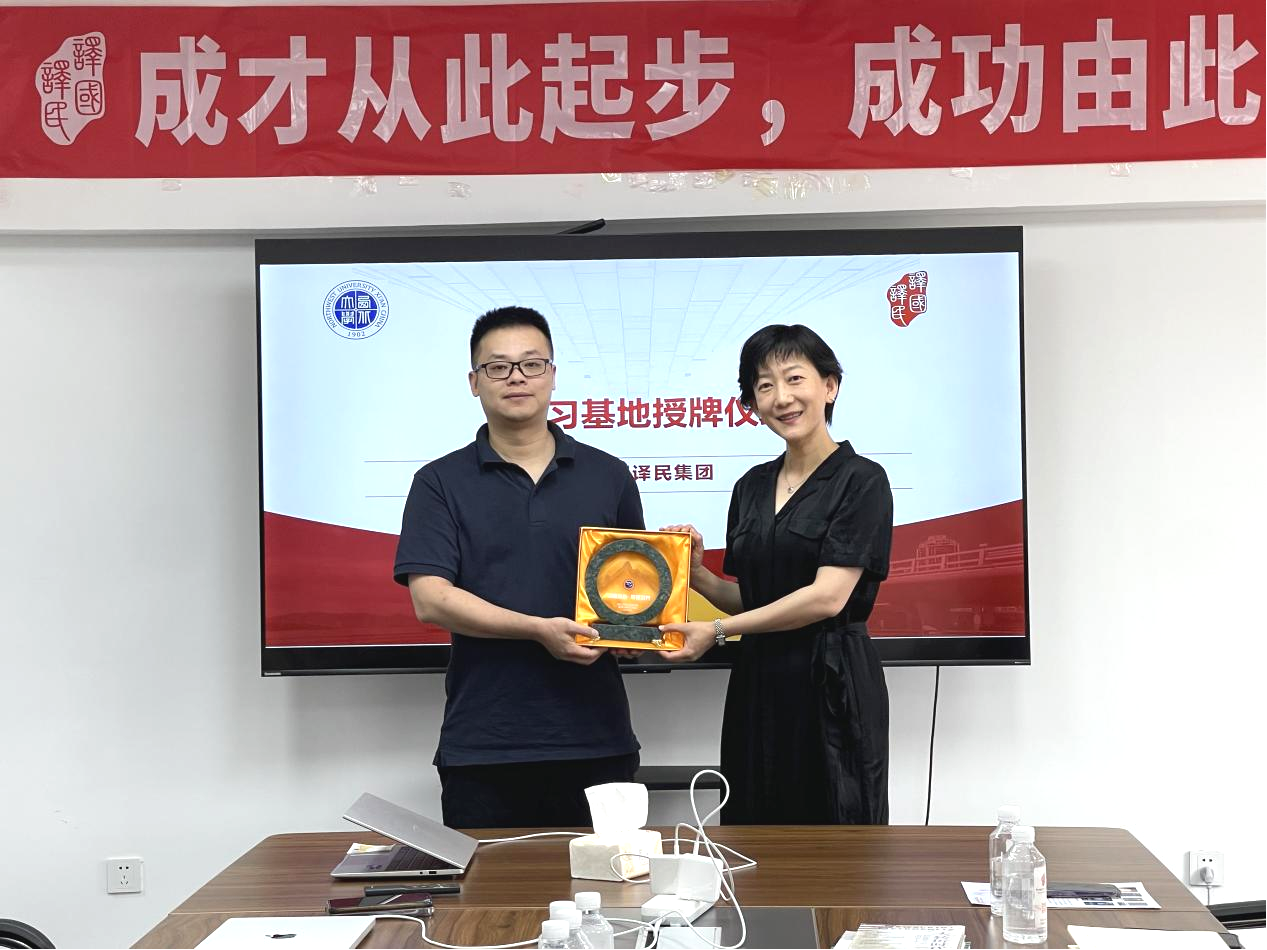 会后,双方代表进行授牌仪式,曹若男代表学院向译国译民集团西安公司赠送了纪念品。