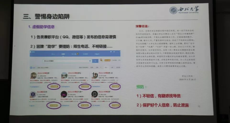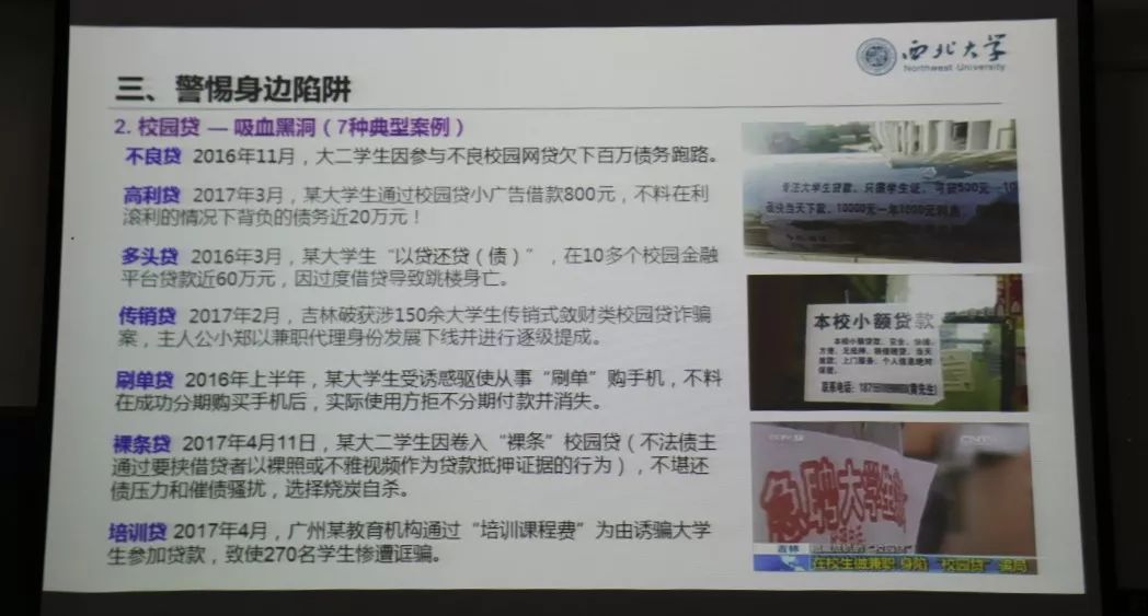 最后,赵老师为同学们敲响警钟——警惕身边陷阱,防范各种虚假助学信息和校园贷,保护个人隐私,防范信息泄露。保持不攀比、不虚荣的健康理性的消费心理。