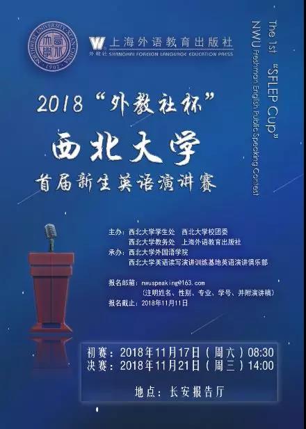 报名方式:2018年11月11日之前将姓名、性别、专业、学号等个人信息以及个人照片及演讲稿电子版以附件形式发送至邮箱nwuspeaking@163.com。完成报名后记得联系你的英语老师预约辅导时间哦!