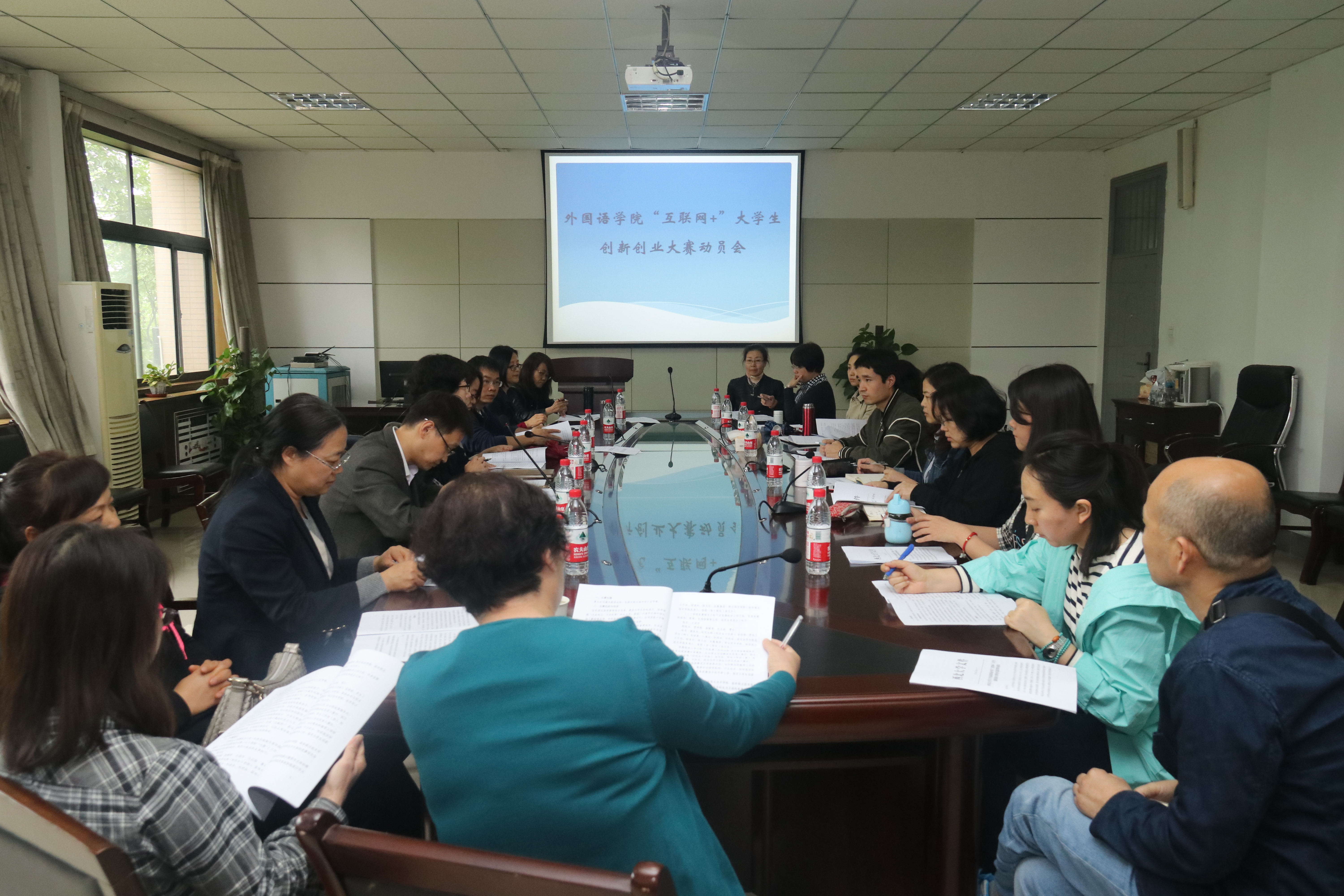 2018年4月25日下午2点半,我院在6315会议室召开了“互联网+”大学生创新创业大赛动员会。参加动员会的有党委副书记徐自成、教学副院长曹若男、英语系主任苏蕊、日语系主任张子如及各班班主任。