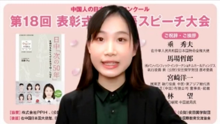 12月12日下午,第18届“全中国日语作文大赛”颁奖仪式暨日语演讲大会在线上举行。日本驻华大使垂秀夫和赞助企业代表出席并致辞。李月同学作为第18届日本大使奖获得者出席并发表演讲。来自中国各地的获奖者、指导教师及各界人士约200人参加。