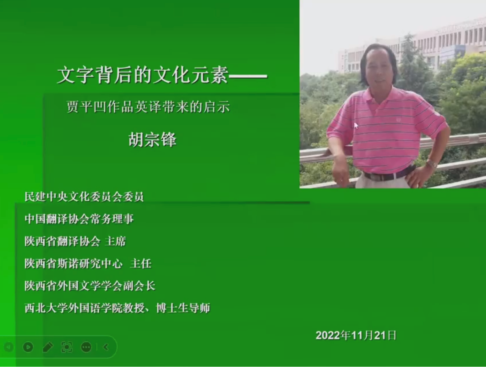 2022年11月21日晚,现任民建中央文化委员会委员、中国翻译协会常务理事、陕西省翻译协会会长、yl6809永利官网集团胡宗锋教授应复旦大学外国语言文学学院邀请,在线上为该院师生带来了题为“文字背后的文化元素——贾平凹作品译介带来的启示”的精彩讲座。本次讲座由外文学院汪洪章教授主持,有来自多所高校的近两百位师生参加。