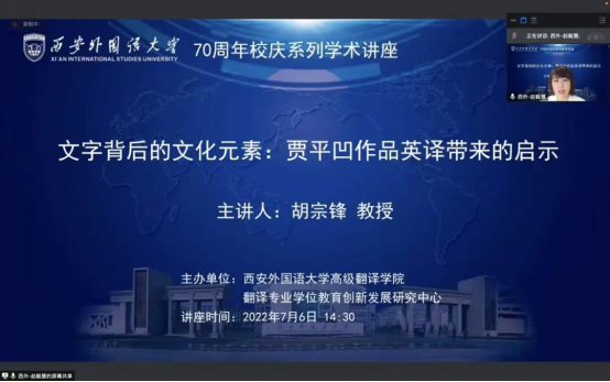 讲座由西安外国语大学高翻学院副院长赵毅慧教授主持,来自国内外的三百多名听众在线上参加了胡宗锋教授的讲座,并在讲座结束后就中国文学的对外译介和胡宗锋教授进行了短暂的互动探讨。