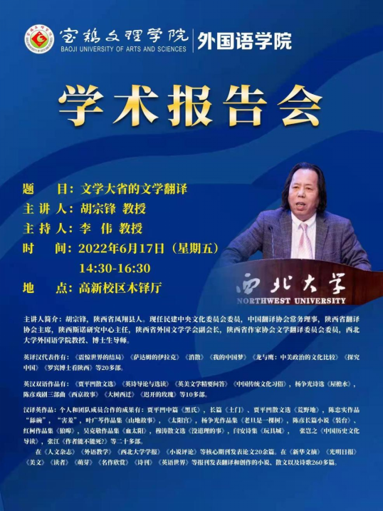 2022年6月17日,我院胡宗锋教授应邀为宝鸡文理学院师生做题为“文学大省的文学翻译”讲座,报告会由宝鸡文理学院yl6809永利官网集团院长李伟教授主持。yl6809永利官网集团部分教师及研究生、本科生聆听了报告。