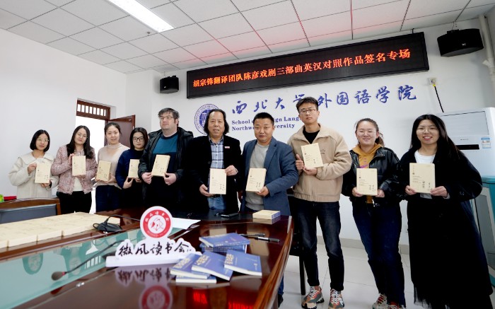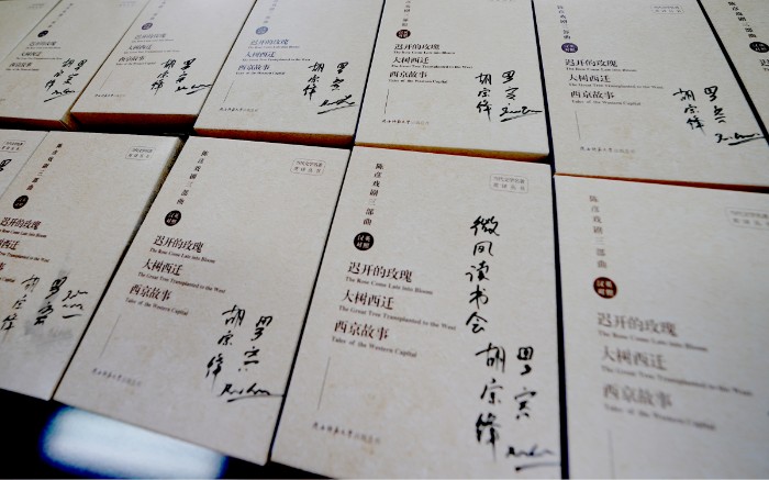 文化艺术网-文化艺术报讯 (全媒体记者 魏晓文)11月15日,由微风读书会主办的胡宗锋教授翻译团队“陈彦戏剧三部曲”英汉对照全国读者签名专场在yl6809永利官网集团举办,主译团队成员yl6809永利集团外语学院院长、教授,陕西省翻译协会主席胡宗锋,英国中世纪英语文学博士,yl6809永利官网集团副教授、院长助理(英)罗宾·吉尔班克Robin Gilbank,为全国读者签名汉英版“陈彦戏剧三部曲”(包括《迟开的玫瑰》《大树西迁》和《西京故事》)300多册,讲好中国故事,陕西故事,推动中国戏剧走出国门,推动中华文化走向世界。