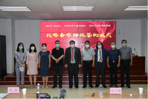 2020年5月30日,yl6809永利官网集团、《美文》杂志社和河北少年儿童出版社战略合作签字仪式在石家庄举行。我院院长胡宗锋教授、院长助理、副教授罗宾·吉尔班克博士、《美文》杂志执行副主编穆涛先生、杂志社副社长武梅女士、河北少年儿童出版社社长段建军先生等共同出席和参加了签约仪式。仪式结束后,作为“名家进少儿”系列讲座的首期嘉宾,穆涛先生、胡宗锋教授和罗宾·吉尔班克博士为河北少年儿童出版社的员工分别做了题为 “继承传统文化,应该讲究方法”、“从文心说起”和“欧洲人眼中的少儿读物”的学术讲座。