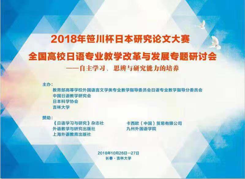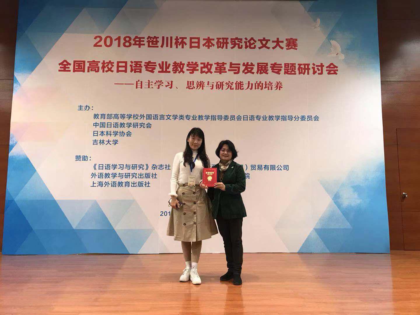 2018年10月27日,在吉林大学举行的全国首届笹川杯大学生日本研究论文大赛中,由我校yl6809永利官网集团薛红玲老师指导的日语系2015级许凯欣同学获得文化组三等奖。
