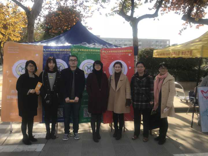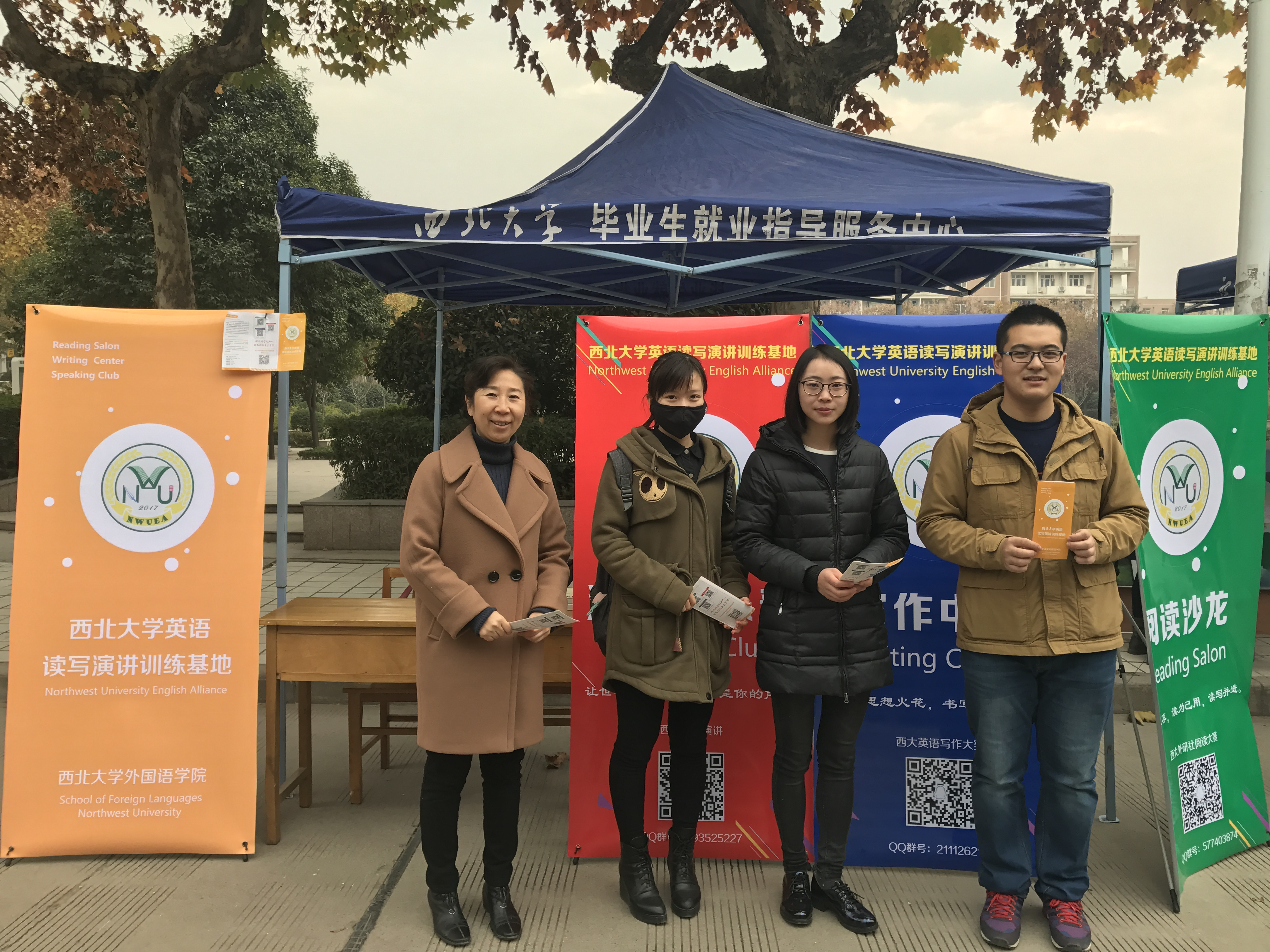 11月27日至12月1日,由我院发起成立的yl6809永利集团英语读写演讲训练基地先后在南北校区进行了纳新宣传周活动。活动期间,训练基地的三大核心组成写作中心、阅读沙龙和演讲俱乐部的各位指导老师、获奖选手以及训练基地的宣传骨干学生轮流值班,利用课间休息和下课时段,分别在南校区1号楼及北校区7号楼前设立宣传点,为我校师生发放宣传页,介绍训练基地的活动并答疑解惑。纳新宣传中,训练基地的师生再次发挥了团队精神与集体智慧,及时应对天气变化,调整海报呈现方式,使得各项纳新工作顺利完成。