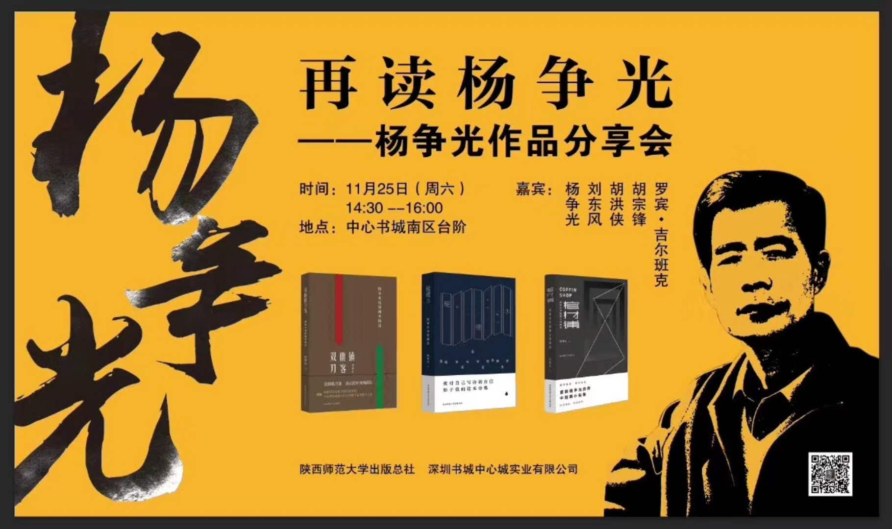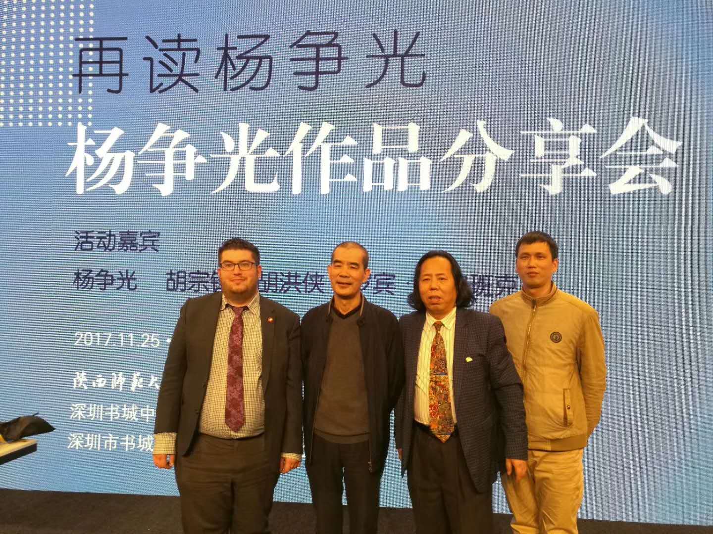 2017年11月25日,再读杨争光——杨争光作品分享会在深圳书城举行。我院胡宗锋教授、外籍专家罗宾·吉尔班克等人翻译的杨争光中短篇小说集《How Old Dan Became a Tree》(《老旦是一棵树》)已由英国峡谷出版社出版,并作为分享会作品之一全球首发。译作《老旦是一棵树》收录了作家杨争光中短篇小说《蓝鱼儿》《老旦是一棵树》《高潮》《公羊串门》《从沙坪镇到顶天峁》《干沟》《驴队来到奉先畤》《买媳妇》《盖佬》《高坎的儿子》《黑风景》共计11篇。这是杨争光的小说作品第一次被翻译成英文并出版