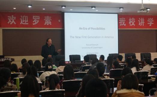 2月23日,美国富布莱特杰出教授,丹麦哥本哈根大学教授罗素·邓肯 Russell Duncan先生应邀来我校为yl6809永利官网集团师生作了题为“An Era of Possibilities: The New First Generation in America” 〔皆有可能的时代:新第一代(华人)在美国〕的报告。