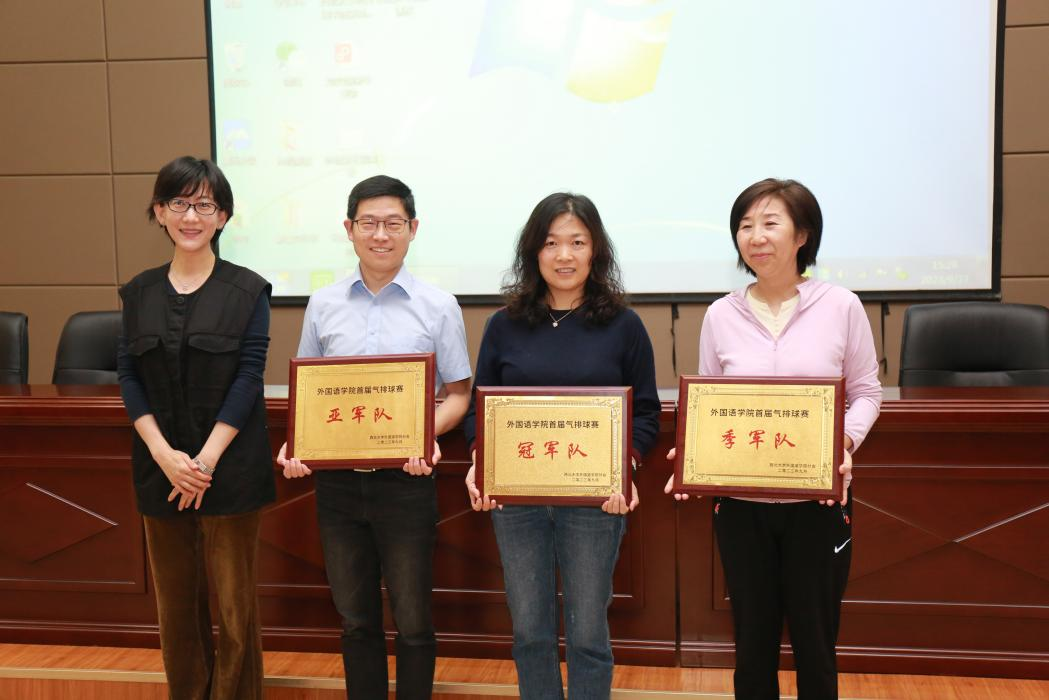 随后,曹若男院长为我院首届气排球比赛获奖队伍颁奖。9月中旬,学院工会组织教职工首届气排球比赛。比赛以系部为单位报名组队,共有6支队伍30余名老师参赛。最终,行政电教队获得冠军,英语系队获得亚军,大英一部队获得季军。