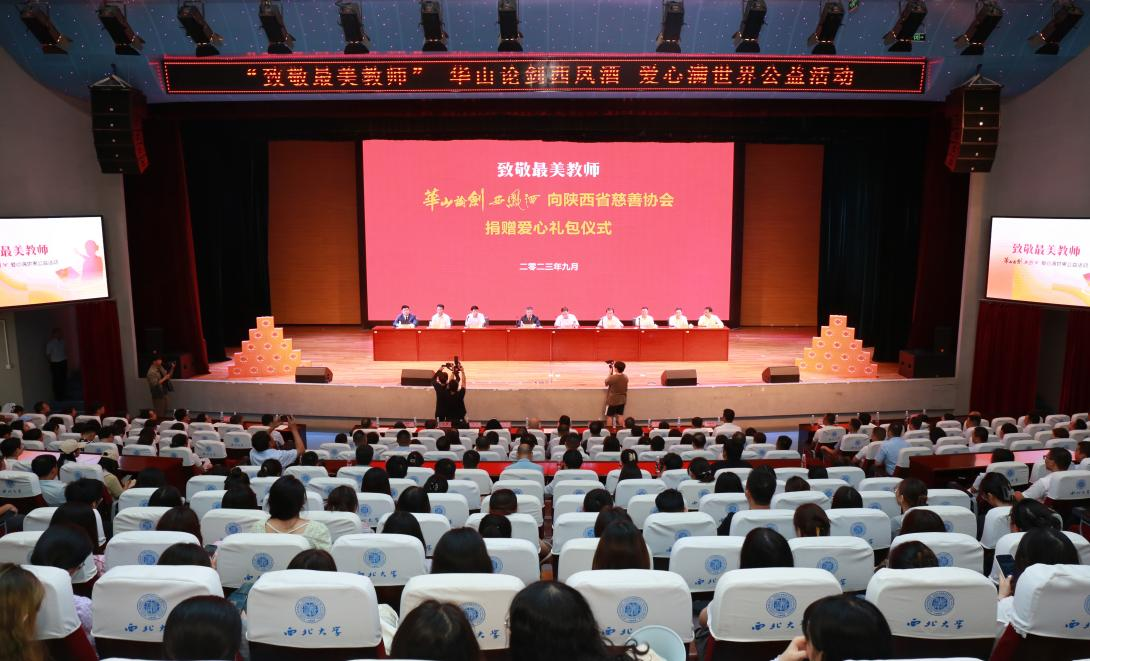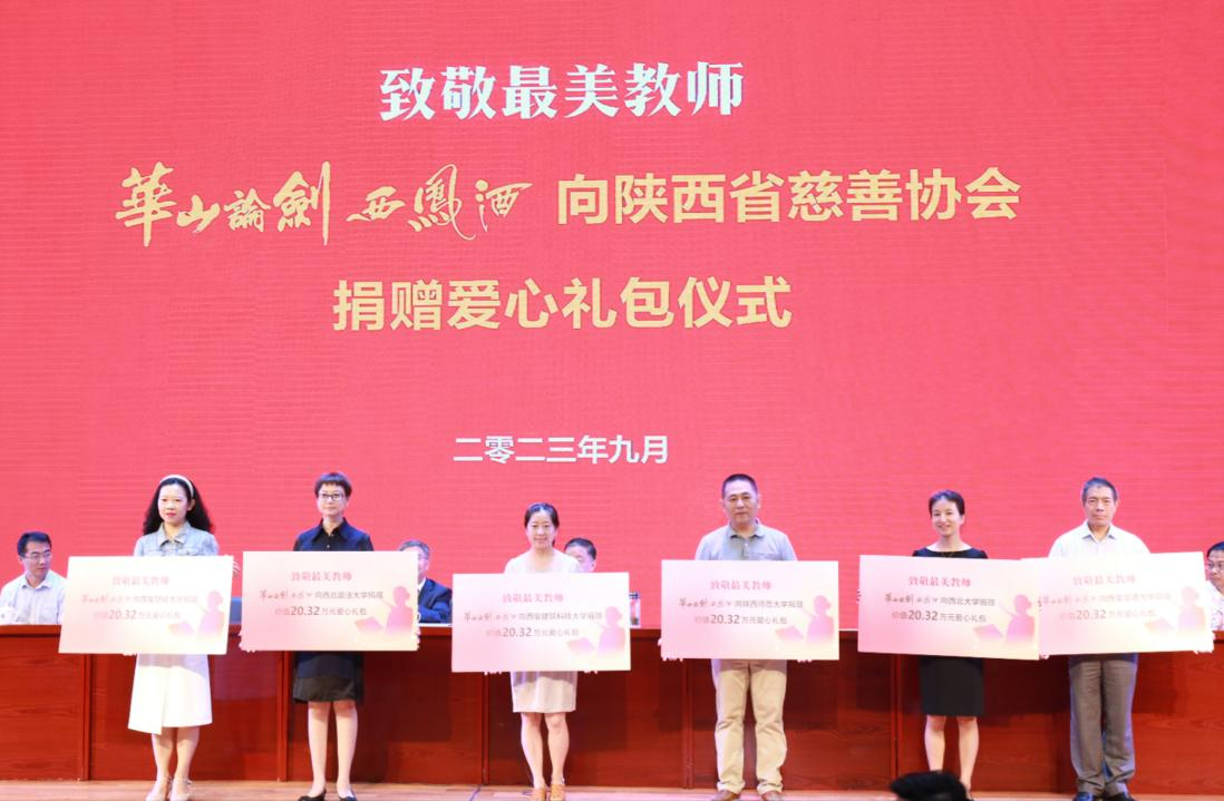 2023年9月8日上午,在第39个教师节来临之际,华山论剑西凤酒“致敬最美教师”爱心满世界公益活动在yl6809永利集团长安校区星空报告厅举行。陕西省人大常委会原副主任、省慈善协会会长吴前进,陕西省教育厅副厅长王海波,华山论剑品牌管理有限公司董事长董小军,yl6809永利集团校长郭立宏,校党委常委、副校长吴振磊出席活动。省慈善协会、华山论剑品牌管理有限公司、兄弟院校相关负责人,yl6809永利官网集团师生代表参加捐赠仪式。