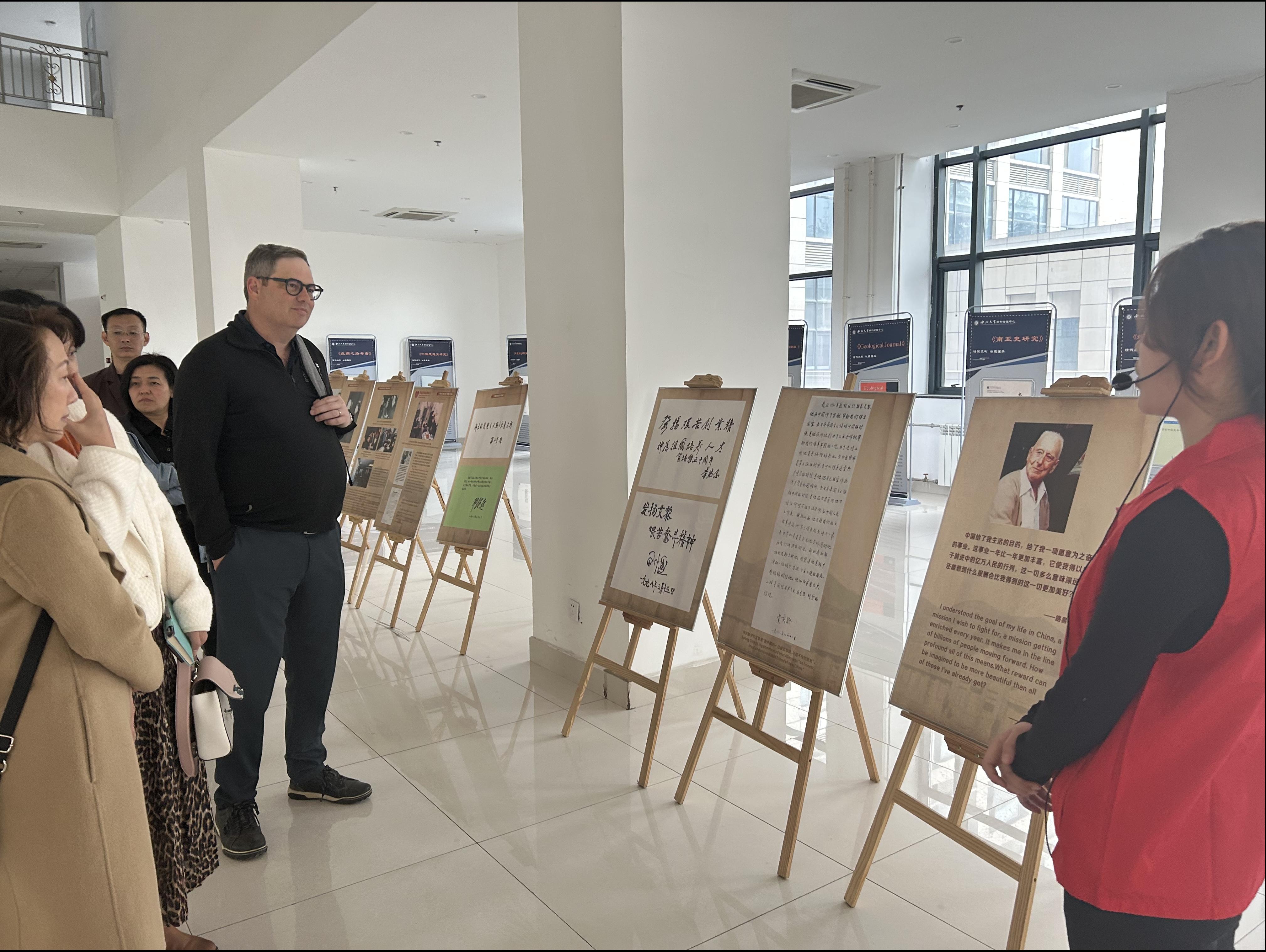 会前,来访嘉宾参观了西学楼一楼大厅的路易·艾黎图片展。新西兰坎特伯雷大学所在地正是中国工合创始人之一、国际友人路易·艾黎的故乡。2022年,在省外办的委托下,我院设立路易·艾黎图片展,纪念中新建交五十周年。我院“红色记忆“讲解队的同学们向新西兰访问团一行介绍了路易·艾黎在中国的贡献,引发了与会者关于国际友人研究的热烈讨论。学生们精彩的英文介绍也赢得了新西兰访问嘉宾的赞赏。