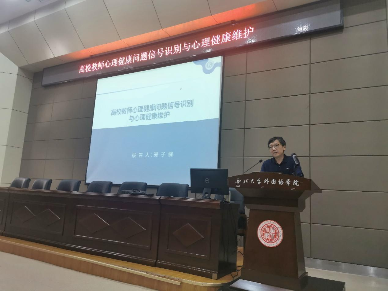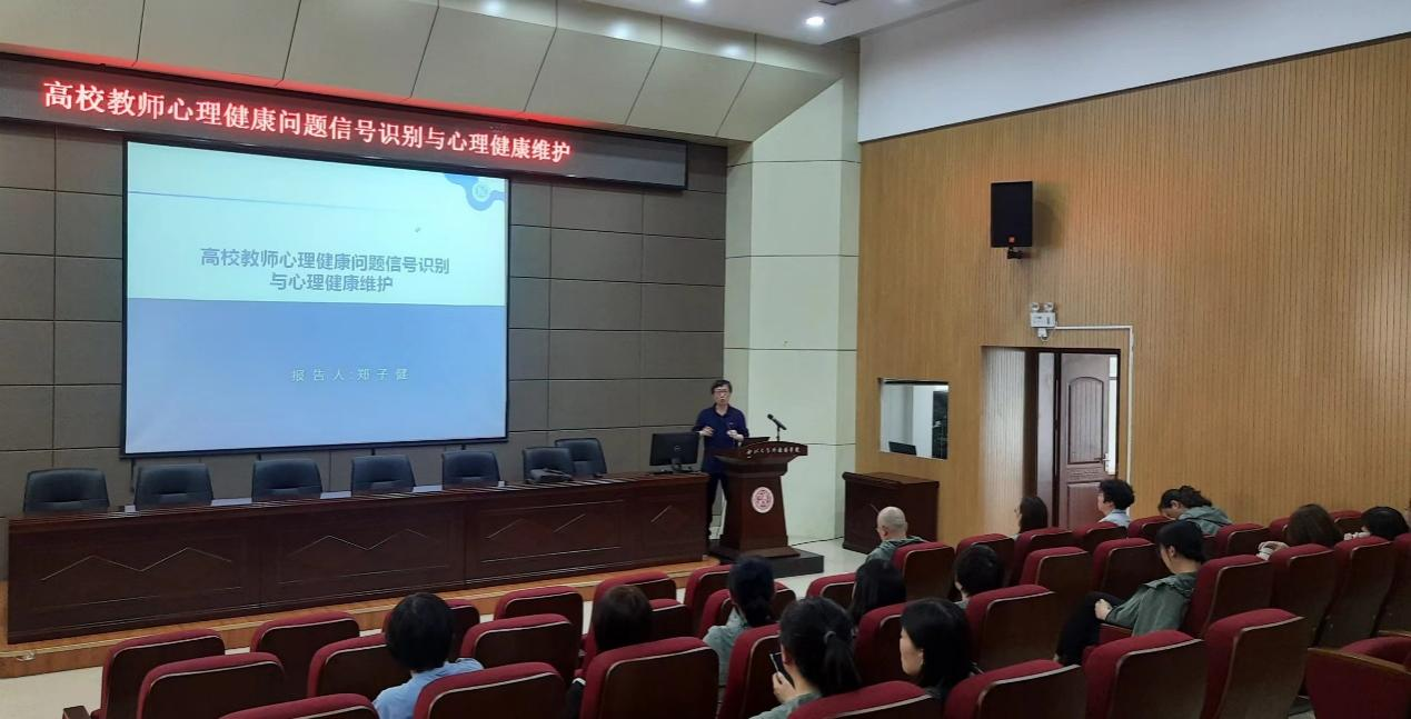 为了维护我院教职工的心理健康,进一步提升教职工的抗压能力,2024年4月17日下午在外语第二课堂报告厅,我院党委和分会特邀郑子健教授(yl6809永利集团公共管理学院心理学教授,应用心理学硕士研究生导师)为教职工做了一场题为“高校教师心理问题信号识别与心理健康维护”的讲座。二十余名教职工代表参加了本次讲座。