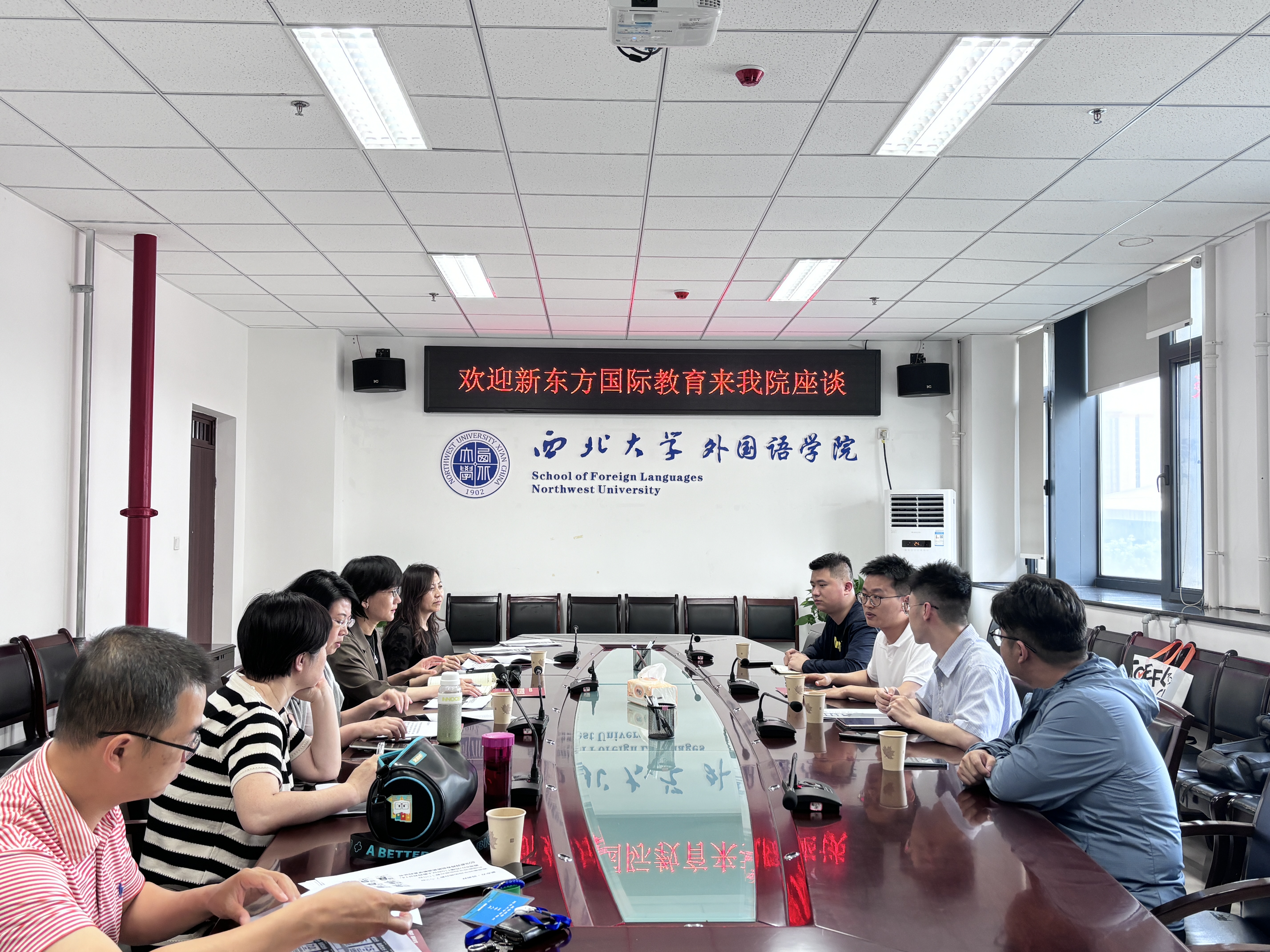 6月14日,新东方国家教育到访yl6809永利官网集团开展校企合作座谈。院长曹若男,英语系主任李铁,MTI教育中心副教授陈汉良,英语系教师于亚莉和宣菁,新东方国际教育西安中心大学项目高级经理陈宏俊,教学产品部教学经历高宇,项目部市场主管王力,项目部yl6809永利集团市场组长高福盛参加活动。