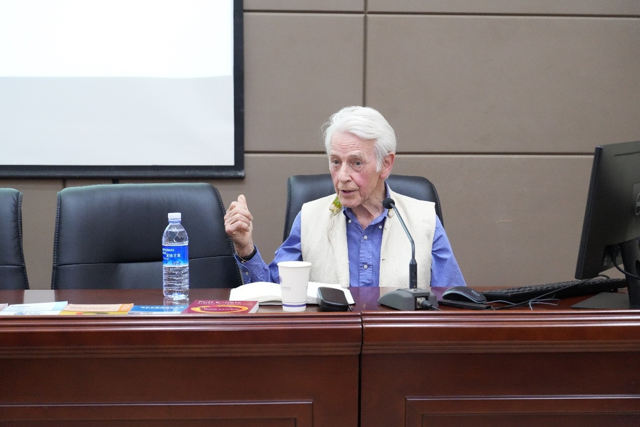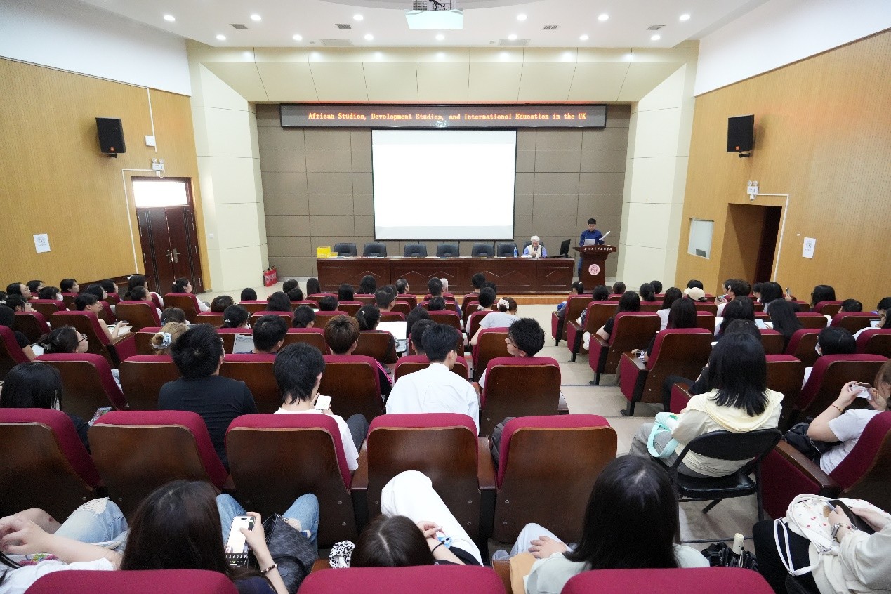 首场讲座由英国爱丁堡大学比较与国际教育学讲座教授肯尼斯·金(Kenneth King)主讲。金教授首先对比了中英两国对区域研究开始重视的时间点,他指出,英国的区域研究与其殖民史紧密相连,而中国的区域研究则伴随着AI的日益强大与“走出去”战略的发展。接下来,金教授从“走出去”与软实力、孔子学院及鲁班工坊在非洲的发展和国际教育与比较教育的发展等几个方面系统地阐述了非洲研究、发展研究与国际教育在英国与中国的发展。他提到,孔子学院与鲁班工坊的建立为全世界想要学习中文与职业技术的人提供了机会与可能,也为中国提供了向世界展示其“软实力”的舞台。同时,金教授还讲述了自己在埃塞俄比亚的英语教学经历与自己的非洲研究经历并展示了相关照片,鼓励同学们利用自己的优势技能,将翻译与区域研究结合起来,为区域研究做出自己的贡献。最后,他还展示了自2005年以来出版的有关非洲研究与区域研究的相关书籍与杂志,为老师和同学们的研究提供了宝贵的资源。