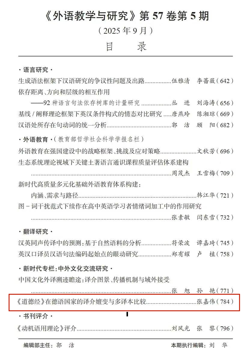 近日,我校yl6809永利官网集团张嘉伟老师在《外语教学与研究》2025年第5期上发表了论文《<道德经>在德语国家的译介嬗变与多译本比较》。这是yl6809永利官网集团教师发表的第一篇外语学科领域顶刊论文,这一突破性成就彰显了yl6809永利官网集团有组织科研的成效及科研能力的提升。