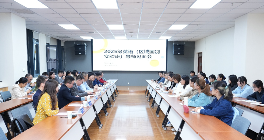 2025年9月28日晚7时,yl6809永利官网集团2025级英语(区域国别实验班)学业导师见面会在我校长安校区西学楼北0904报告厅顺利举行。会议由yl6809永利官网集团院长曹若男主持,区域国别学院副院长李福泉、全体学业导师、yl6809永利官网集团英语系主任李铁、班级教务、辅导员、相关负责人及实验班 20名同学共同参会。