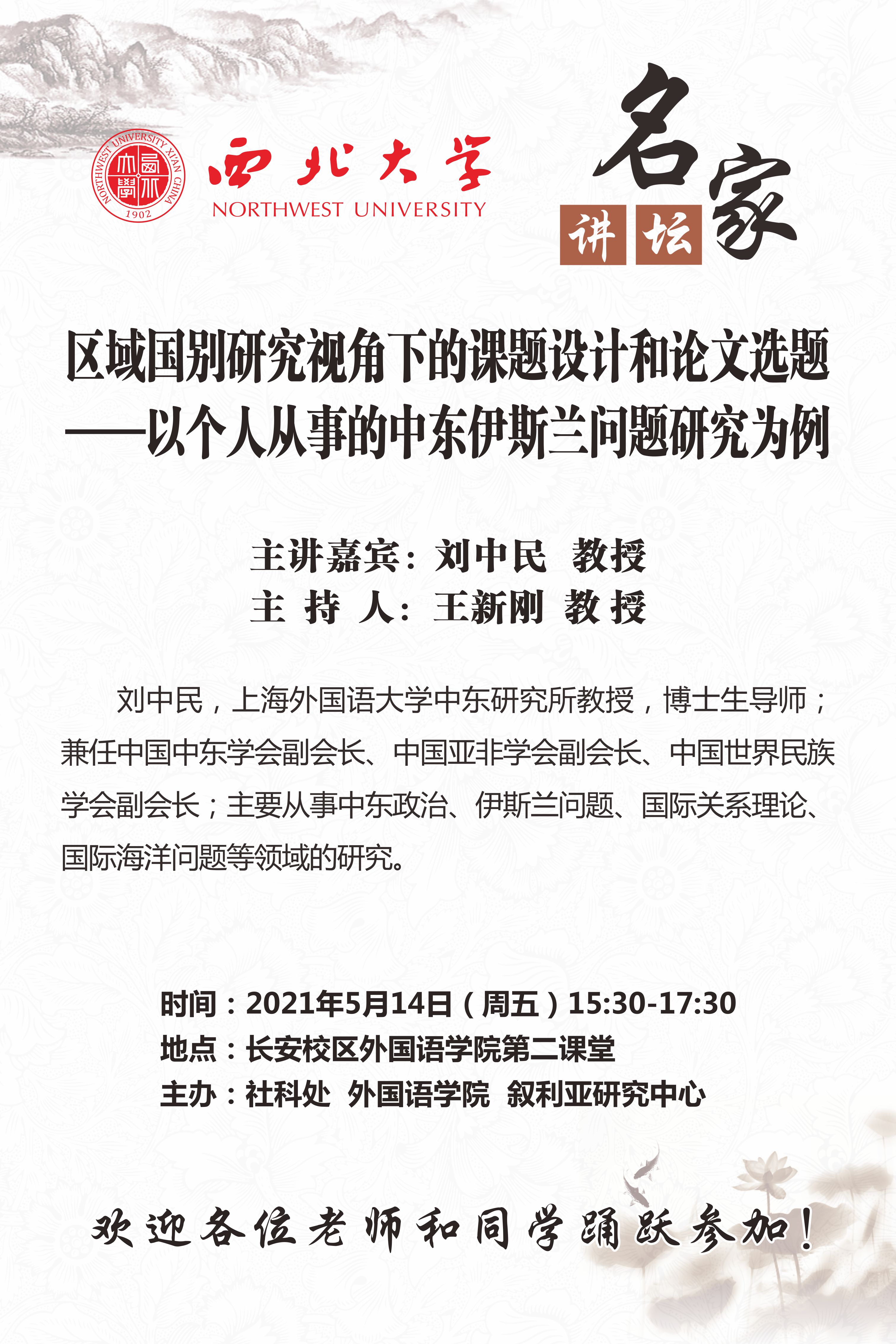 学院定于2021年5月14日(周五)下午15:30召开关于《区域国别研究视角下的课题设计和论文选题——以个人从事的中东伊斯兰问题研究为例》报告,欢迎各位师生积极参加。