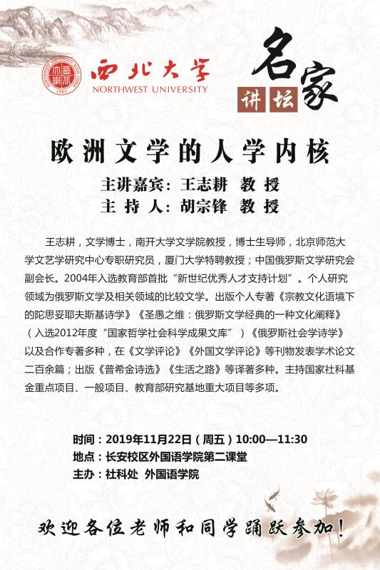 学院定于2019年11月22日(周五)上午10:00召开关于《欧洲文学的人学内核》报告,欢迎各位老师积极参加。