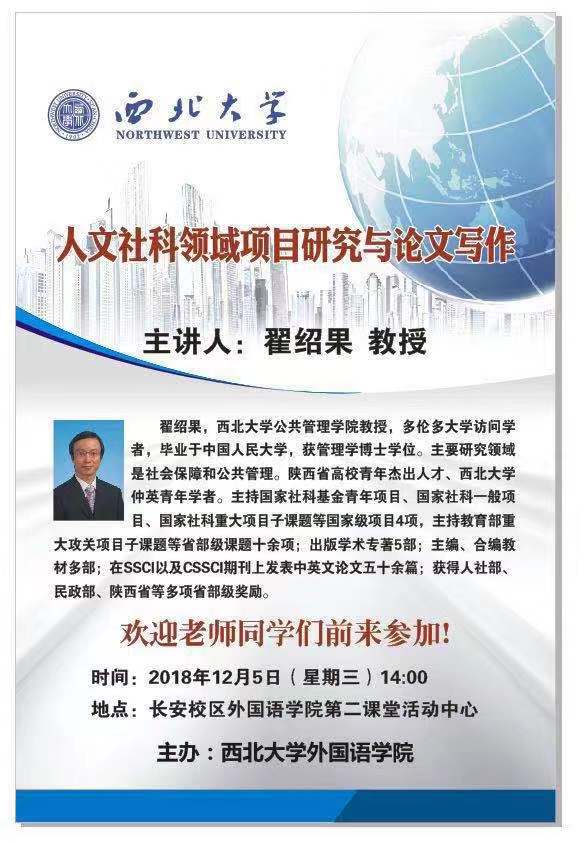 学院定于2018年12月5日(周三)下午14:00召开关于《人文社科领域项目研究与论文写作》报告,请全院无课教职工准时参加。