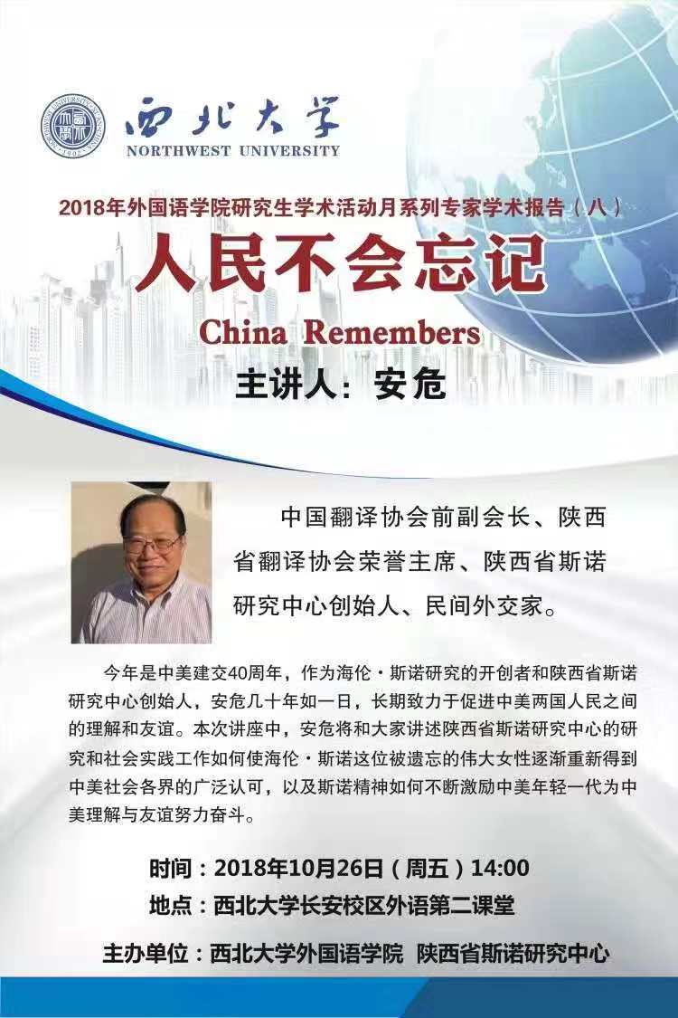 学院定于2018年10月26日(周五)下午14:00召开《人民不会忘记》学术报告及第七届海伦·斯诺翻译奖竞赛颁奖仪式暨“中美理解与友谊树”植树一周年纪念,请全院教职工准时参加。