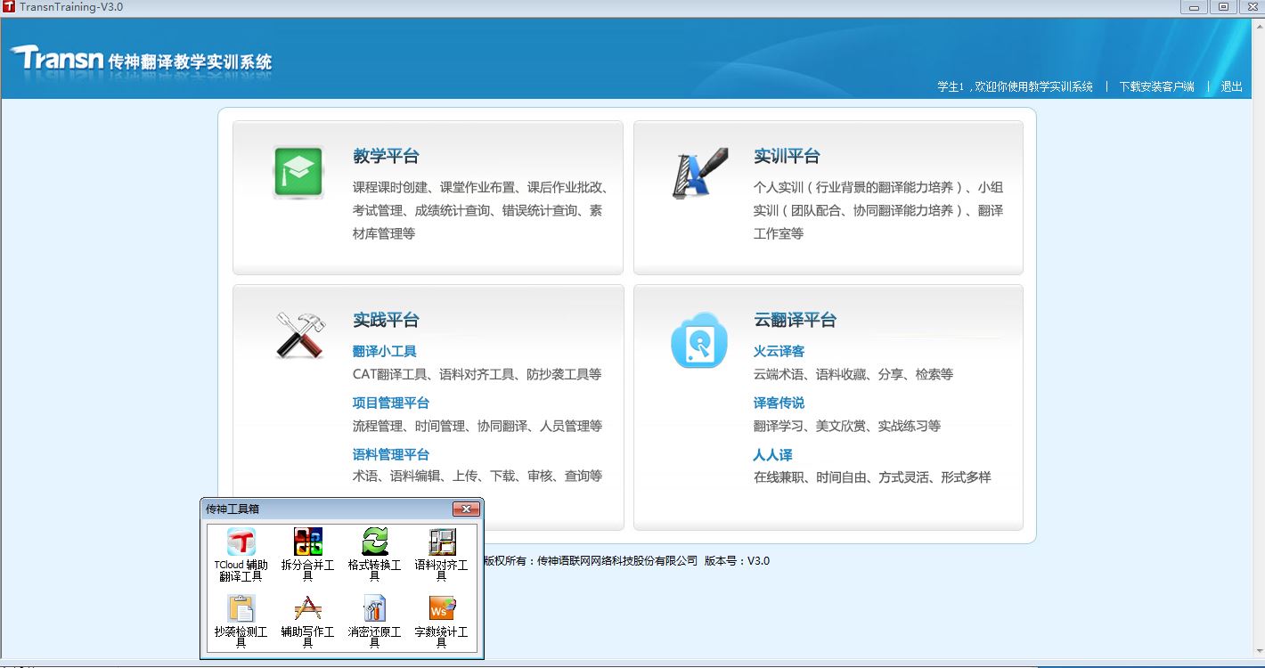 实验中心以服务教学、科研为宗旨,建成计算机辅助翻译学习平台,该平台自带800篇真实翻译项目的教学素材,满足翻译教学需求;同时平台包含机械、金融、汽车、外贸等16个热门行业500万条术语料库,为全校专业提供资源共享平台。我中心与传神公司签订校企合作协议,加强学生创新实践能力的培养,共建多语言服务创新基地、未来翻译人才培讯基地。